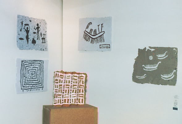 Dibujos sobre papel reciclado fabricado por mi, con restos de papel, tierras, vegetales, y fragmentos de cuerda, inspirados en dibujos de culturas antiguas.